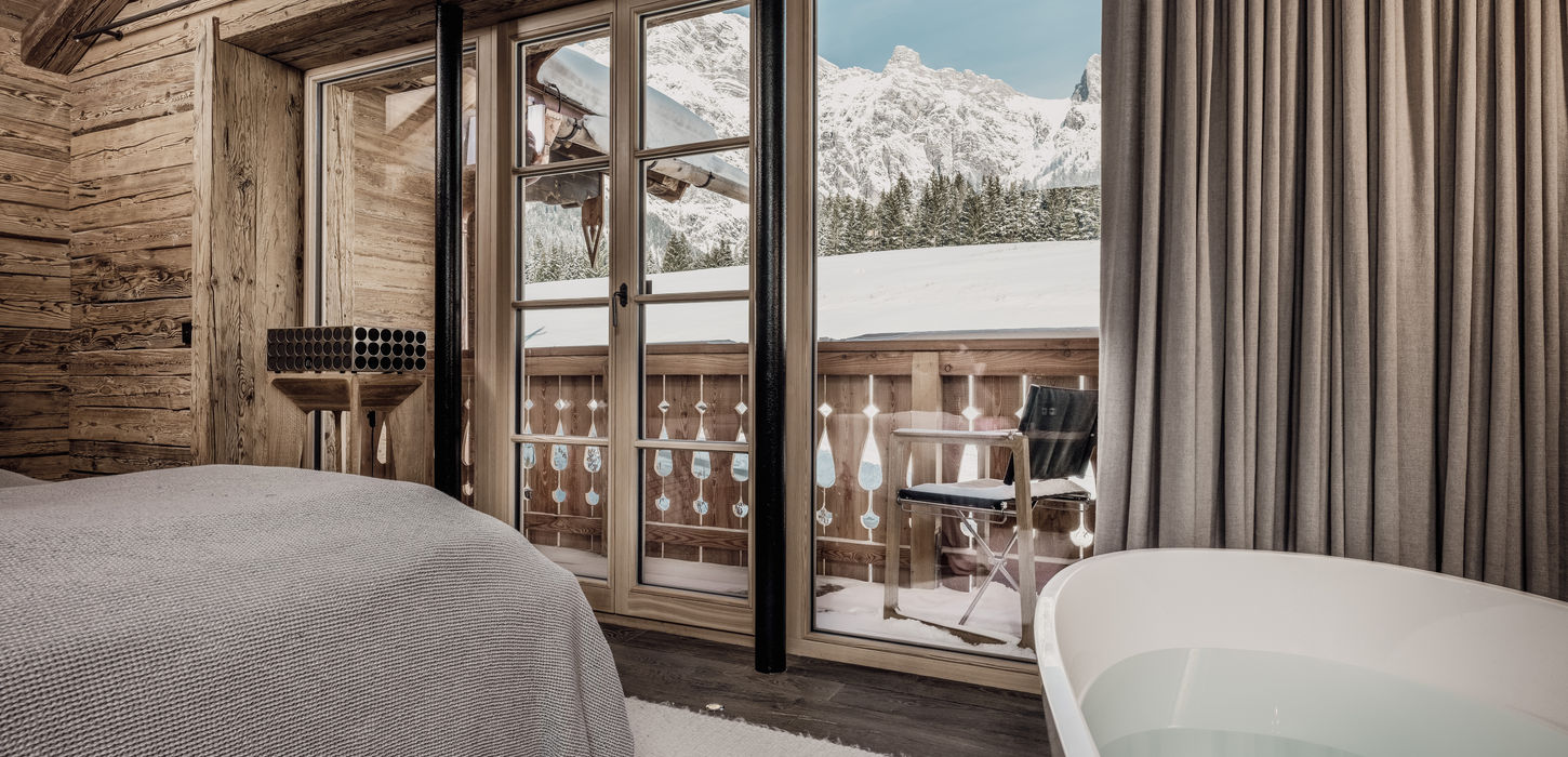 Large double bedroom with exposed roof trusses, views of the Steinberge mountains, a Swiss stone pine bed with a SAMINA sleep system, high-quality linen bedding, and a freestanding bathtub. A shower room with a Dornbracht rain shower, Smart TV, and Poet audio system are also available.